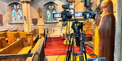 Four cameras along with strategically positioned microphones capture the eulogy and music during the memorial service.